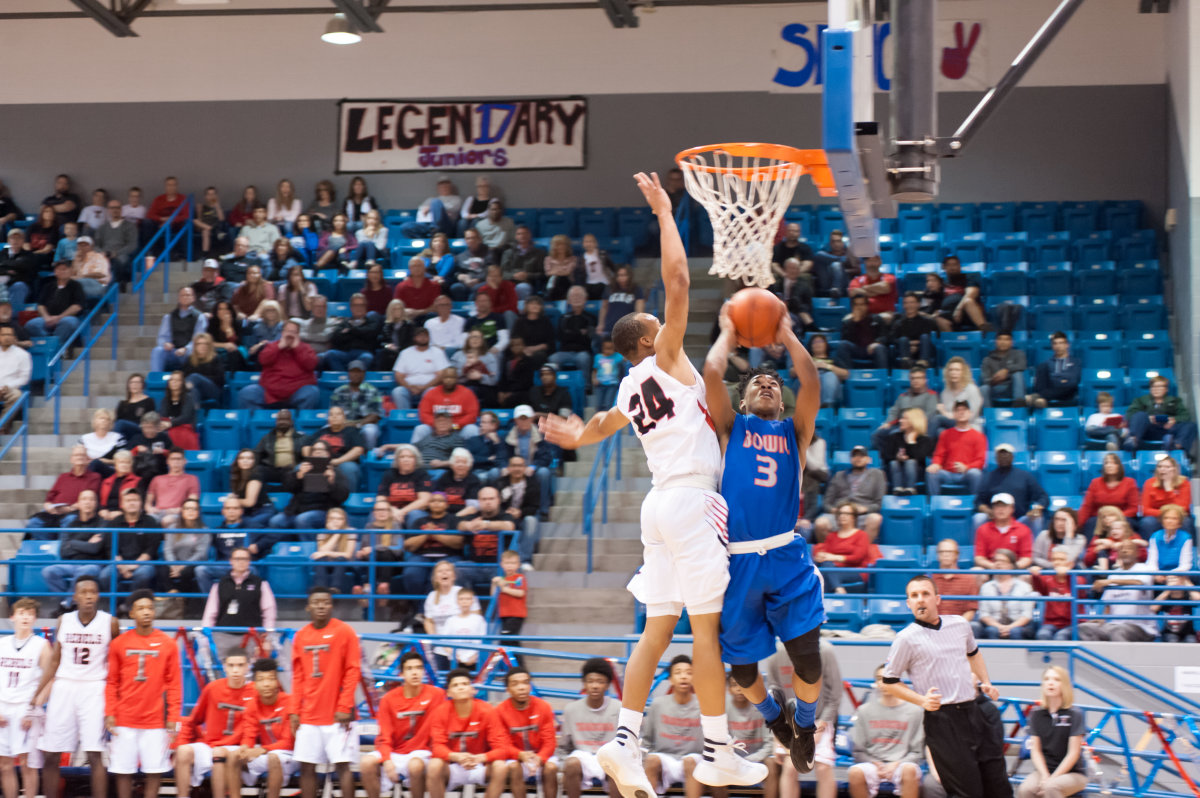Shaie Williams for AGN Media. Tascosa's Darreus Brown forward(10) Completes the dunk againts defender Seyi Imade (34) from Bowie during the area 6A playoff game in Childress, TX. February 26, 2016
