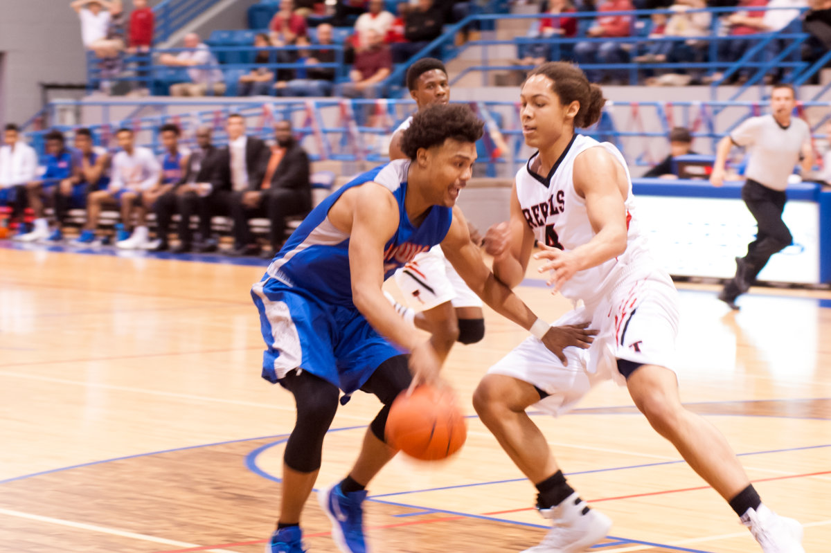 Shaie Williams for AGN Media. Tascosa's Quinn Taylor forward(24) Defends the shot from Nathan Buana (15) Bowie during the area 6A playoff game in Childress, TX. February 26, 2016
